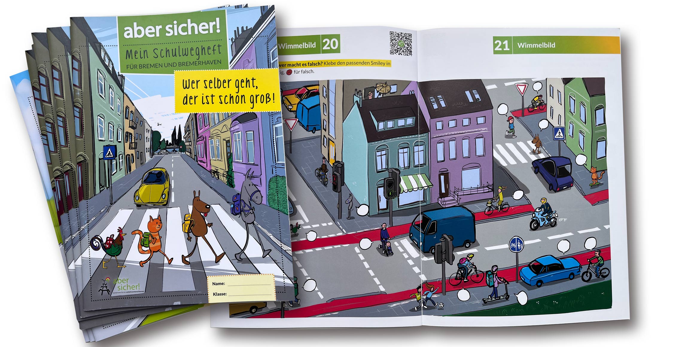 In der Heftreihe „Aber sicher!“ wird Bremer Kindern Verkehrserziehung über anschauliche und kindgerechte Inhalte vermittelt. Die Bremer Stadtmusikanten lehren Kinder spielerisch, sich sicher im Straßenverkehr zu bewegen, und fördern früh ein Bewusstsein für Aufmerksamkeit und Verantwortung.