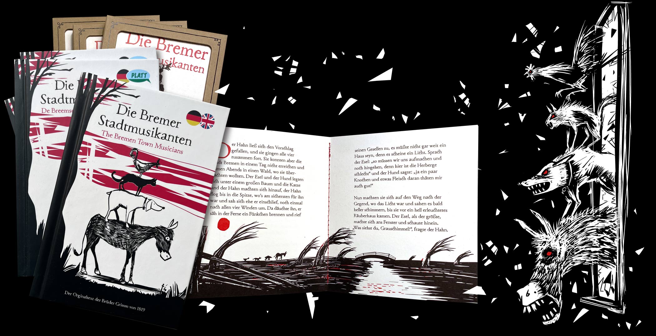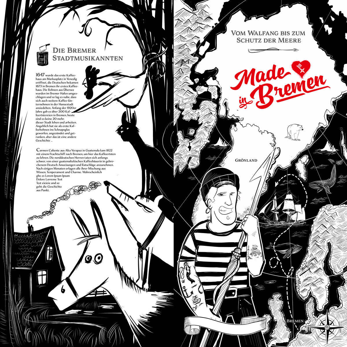 Als Bremer Illustrator habe ich in den letzten Jahren eine Vielzahl Stadtmusikanten-Illustrationen geschaffen. Dabei entstanden Arbeiten für Kinderbücher ebenso wie Arbeiten für ein erwachsenes Publikum, für Unternehmen wie Lotto oder Made in Bremen, die BSAG, aber auch als freie künstlerische Projekte wie bei meinem Film „Die Meatles“. Die Verbindung von traditionellen Themen mit moderner Bildsprache hat einen ganz besonderen Reiz auf mich.