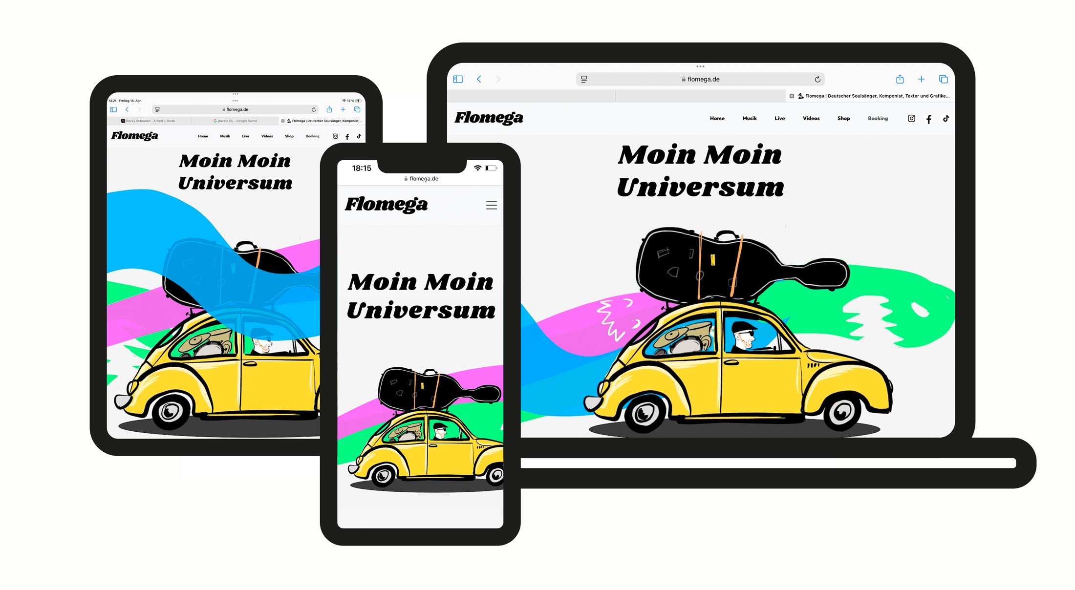 Hier seht Ihr den Onepager für den Bremer Soulsänger Flomega. Im Header erwartet euch eine eingängige Animation, die sofort ins Auge fällt. Darauf folgt der Musikbereich mit allen wichtigen Verlinkungen zu Streams und Downloads. Ein Termin- und Ticketkaufbereich ist direkt eingebunden, so dass ihr schnell und unkompliziert Konzertkarten sichern könnt. Individuelle Illustrationen sorgen für eine persönliche Ansprache und leiten die Besucher gezielt zu wichtigen Bereichen wie dem Shop oder dem Ticketkauf.