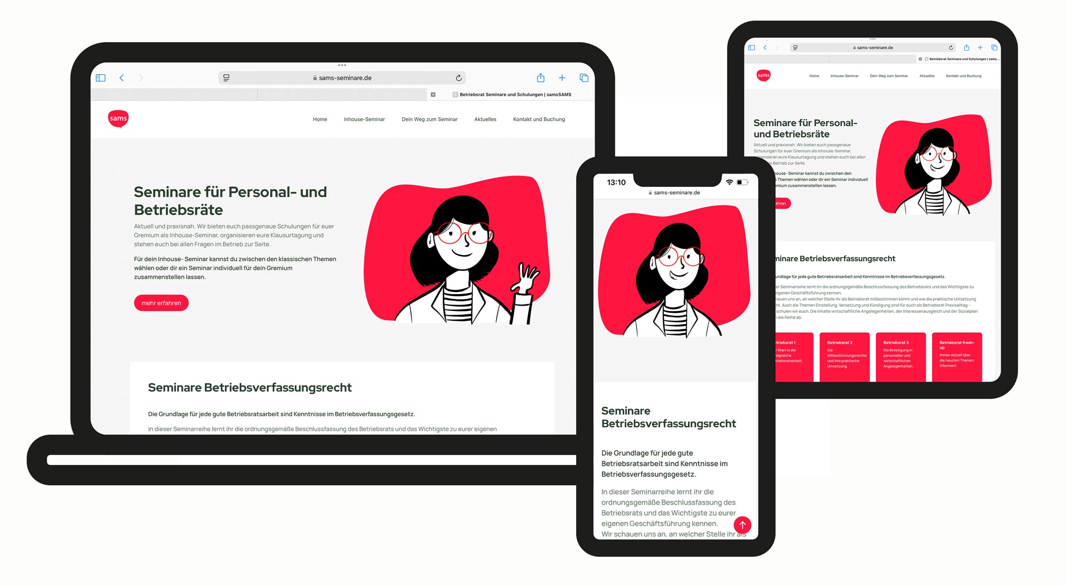 Diese Website für Sams Seminare organisiert die umfangreichen Inhalte übersichtlich und klar. Durch die Illustrationen wird der Besucher freundlich abgeholt. Die klare Struktur erleichtert das Finden der Inhalte.